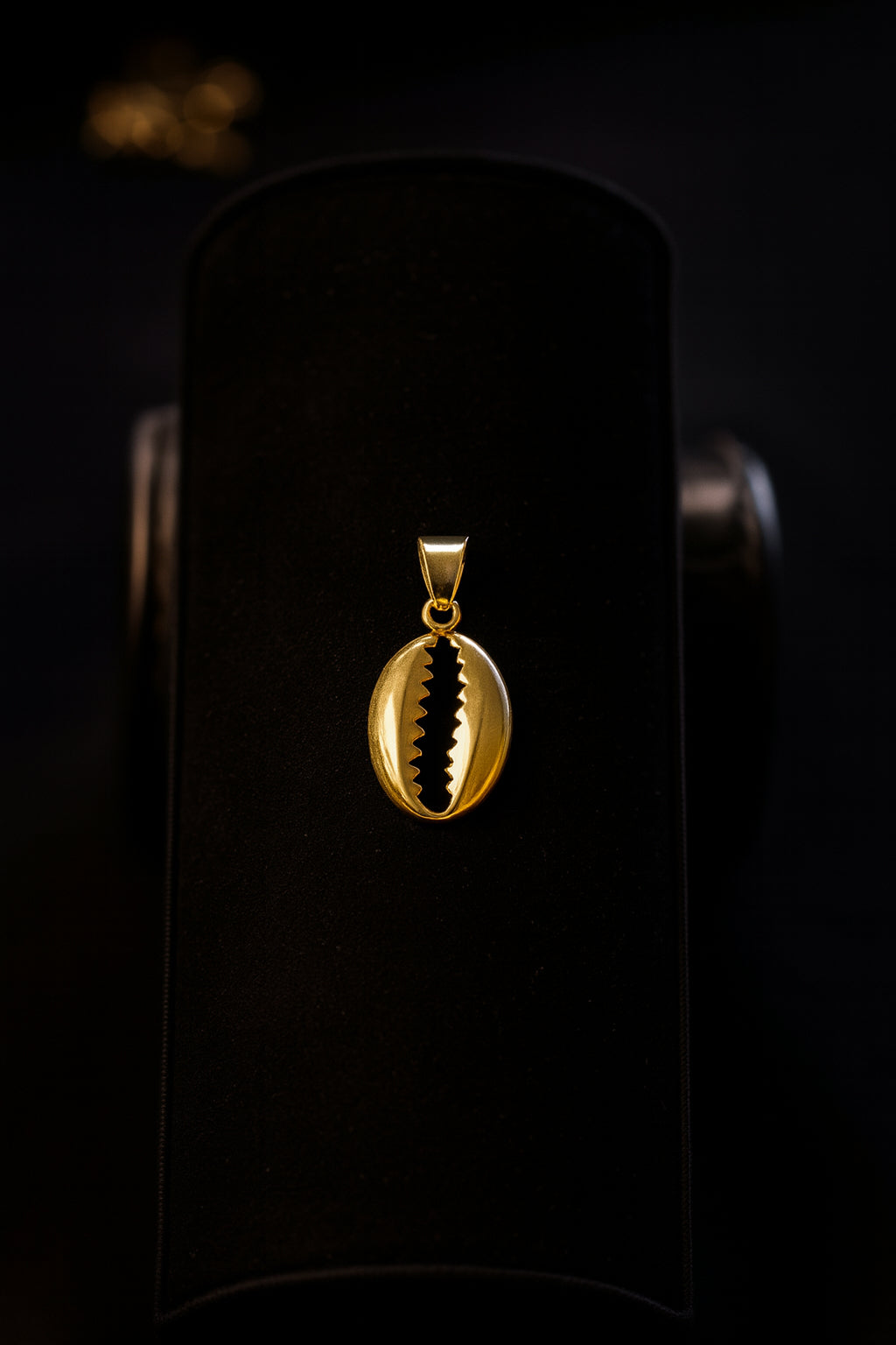 Dije de oro 10K inspirado en el caracol cauri, símbolo de abundancia y protección, con diseño elegante y acabado brillante.