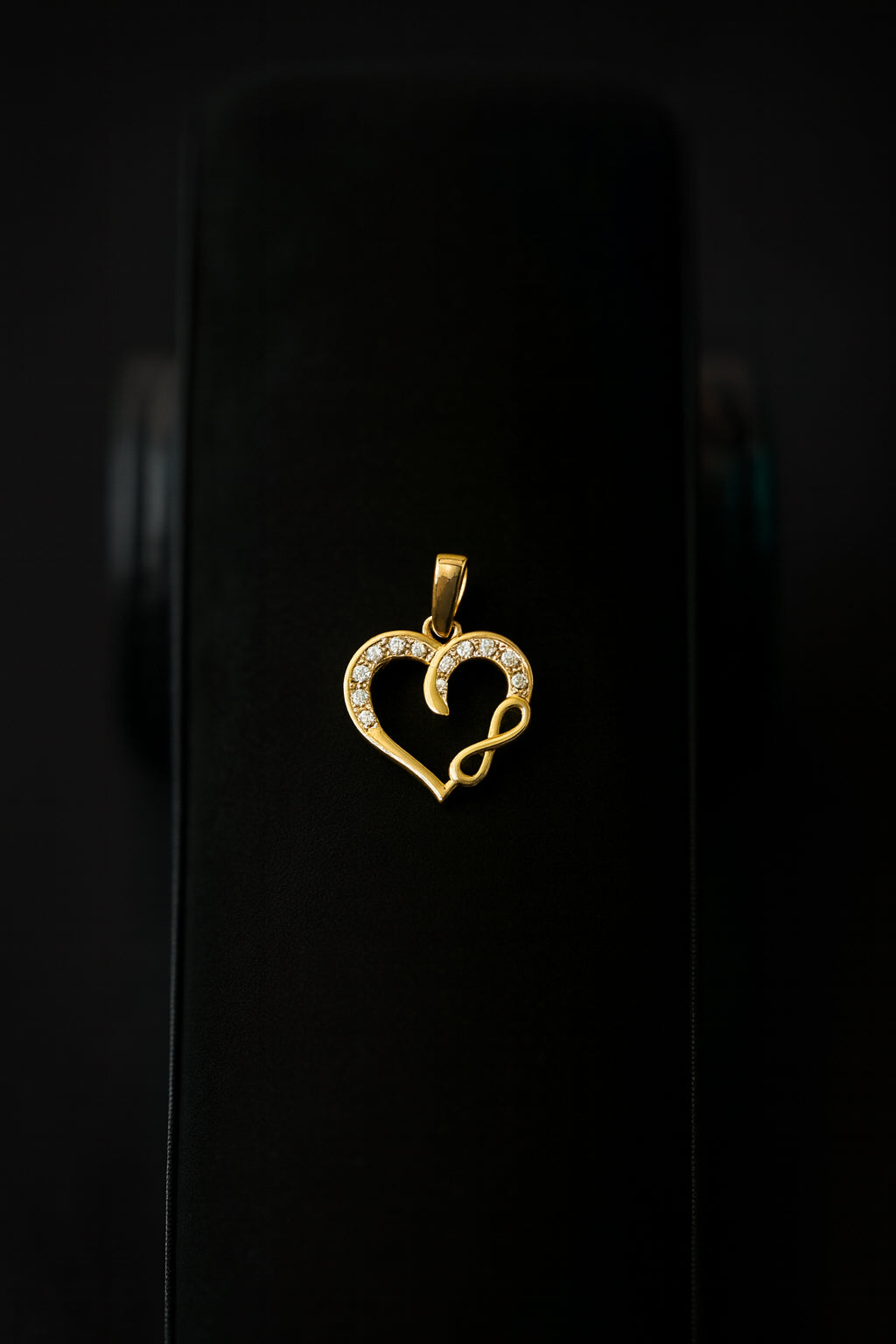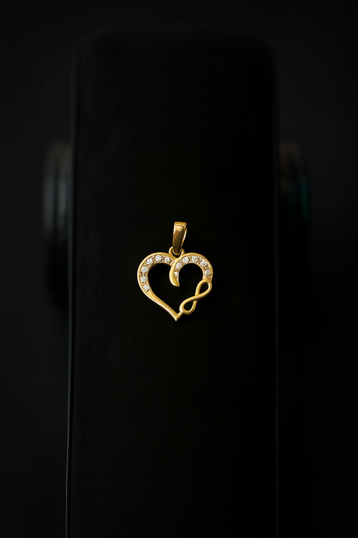 Dije de oro 10K en forma de corazón con símbolo de infinito y detalles en zirconia, perfecto para representar amor eterno con un toque elegante y brillante.