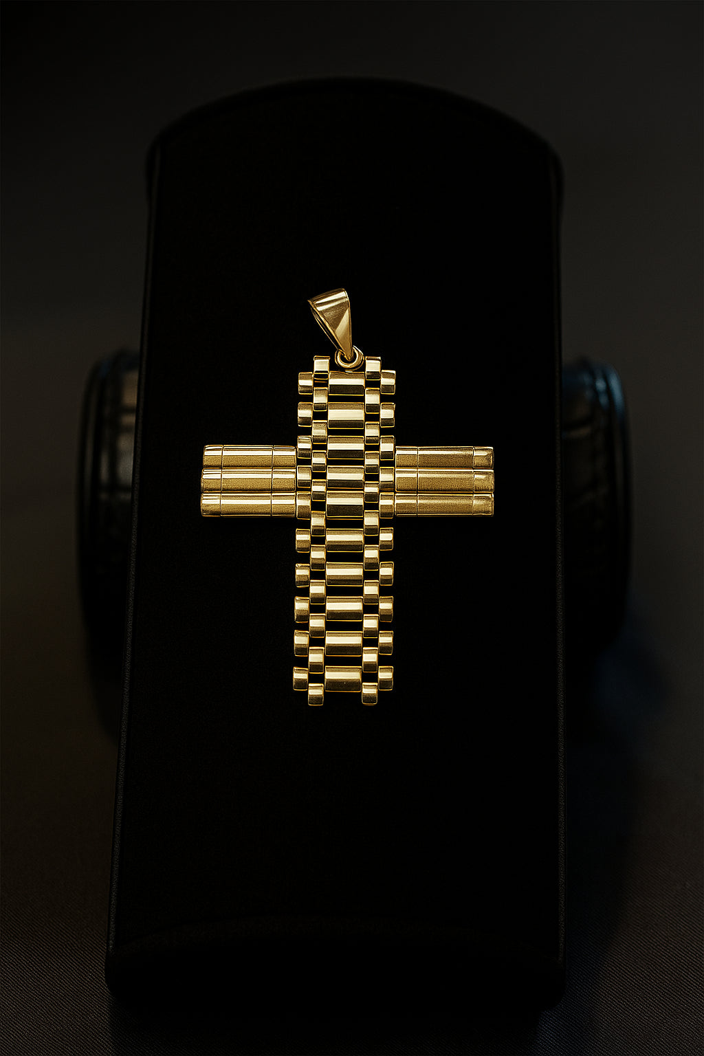 Dije en forma de cruz con diseño tipo presidencial, inspirado en los brazaletes de lujo tipo “President”. Su estructura geométrica de eslabones rectangulares y cilíndricos le da un aspecto robusto, moderno y distintivo, ideal para quienes buscan un accesorio elegante con presencia.
