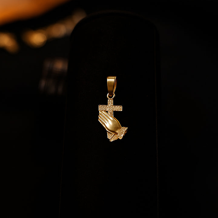 Dije espiritual y elegante elaborado en oro 10K, con manos orando y cruz pavimentada en zirconias que aportan brillo y un toque moderno lleno de significado.