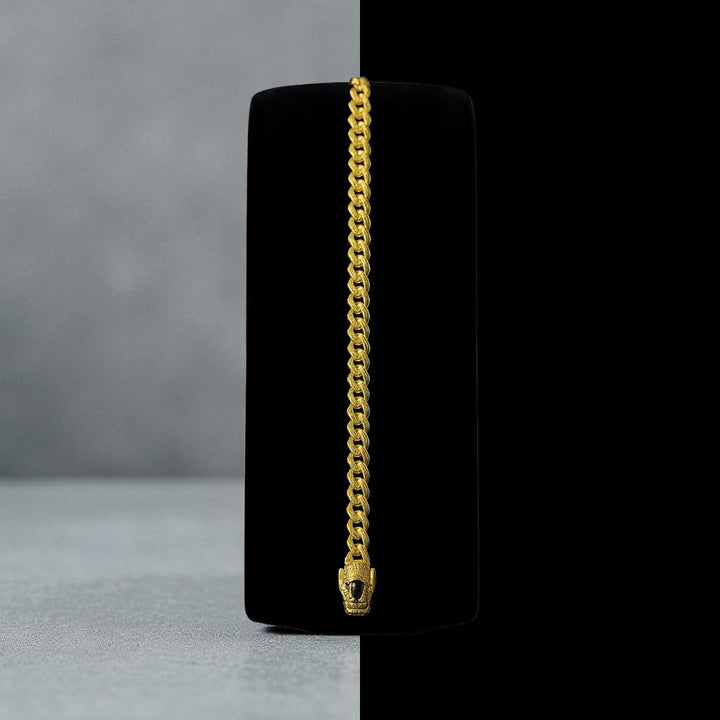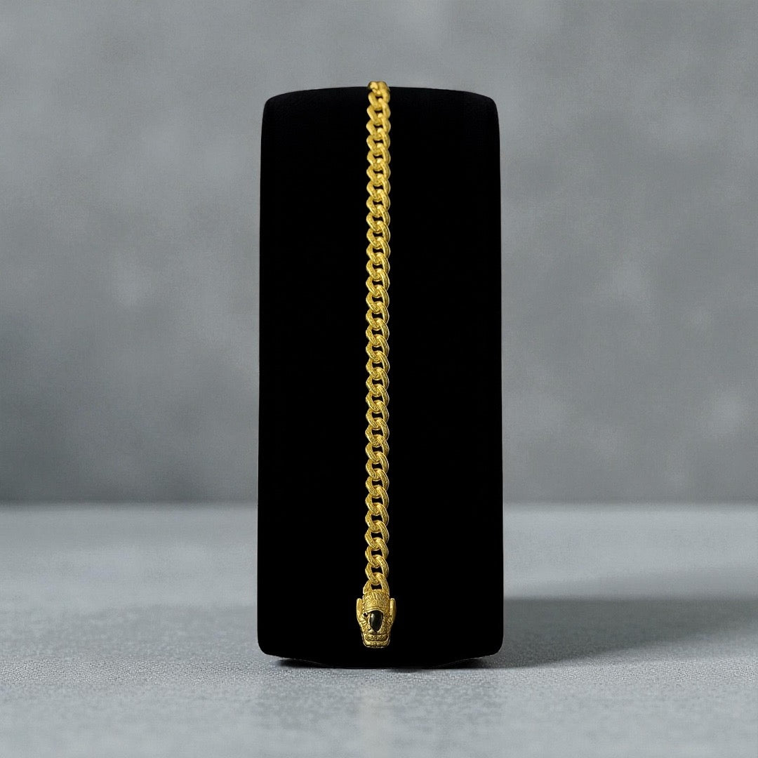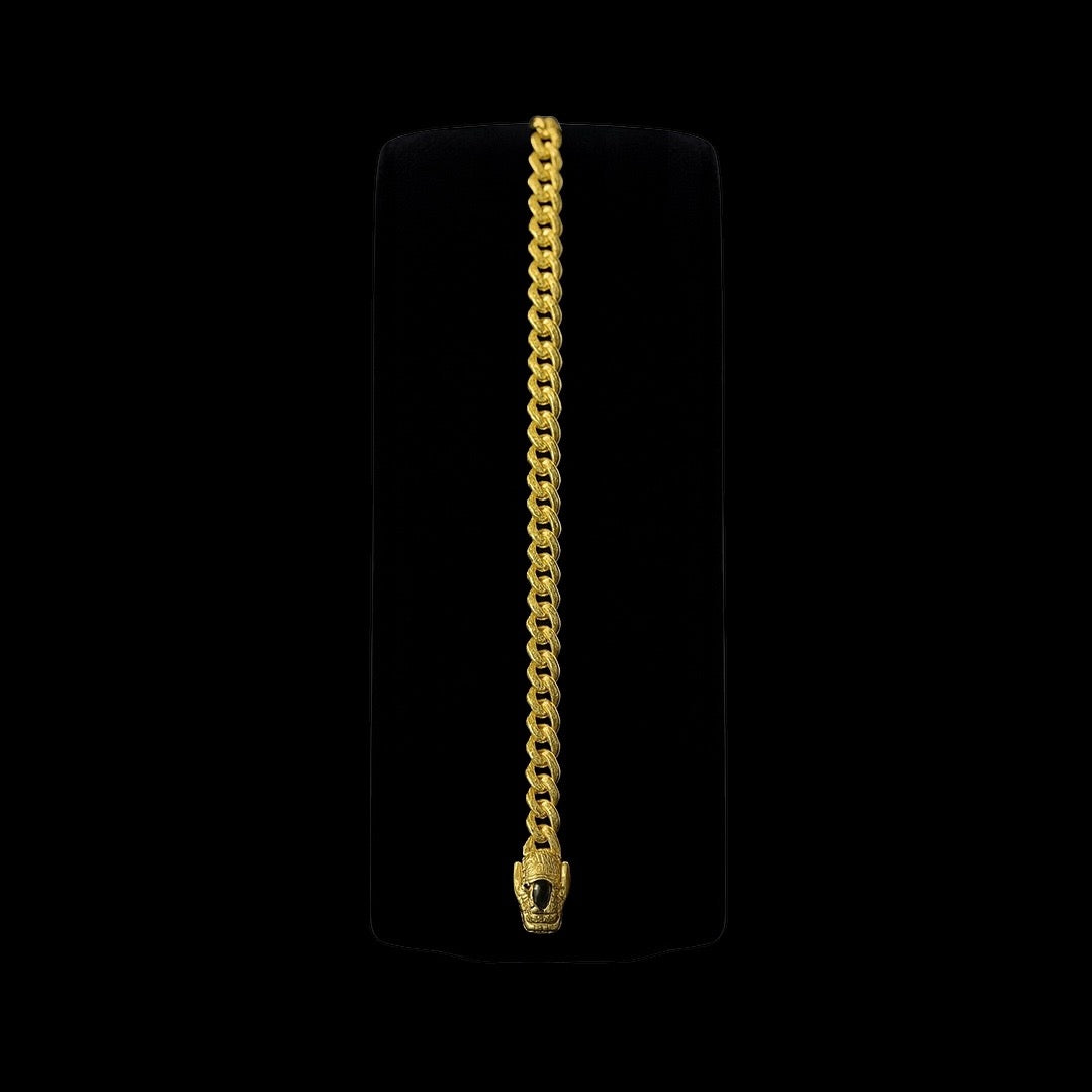 Esta pieza es una pulsera estilo cadena cubana diseñada para lucir elegante, llamativa y con presencia. Fabricada con eslabones gruesos y perfectamente pulidos, destaca por su acabado en tono dorado brillante que resalta al contacto con la luz.