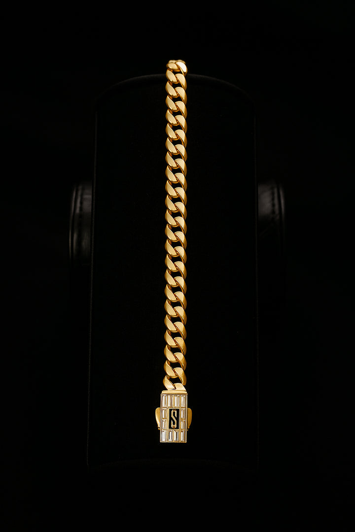 Esta pulsera presenta un eslabón tipo Cuban Link clásico (gordito y plano), reconocido por su durabilidad, presencia y estilo masculino. Su elaboración en Oro 10K y su broche personalizado estilo box clasp con letra “S” en negro la convierten en una pieza única, moderna y diseñada para destacar en cualquier ocasión.