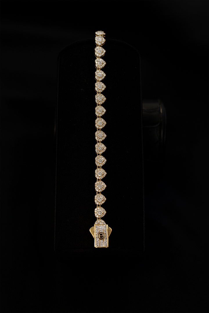 Pulsera elaborada en oro 10K, formada por corazones incrustados con zirconias en micro pavé para un brillo intenso y continuo. Es una pieza elegante, femenina y de acabado premium, perfecta para realzar cualquier look con un toque de lujo moderno.