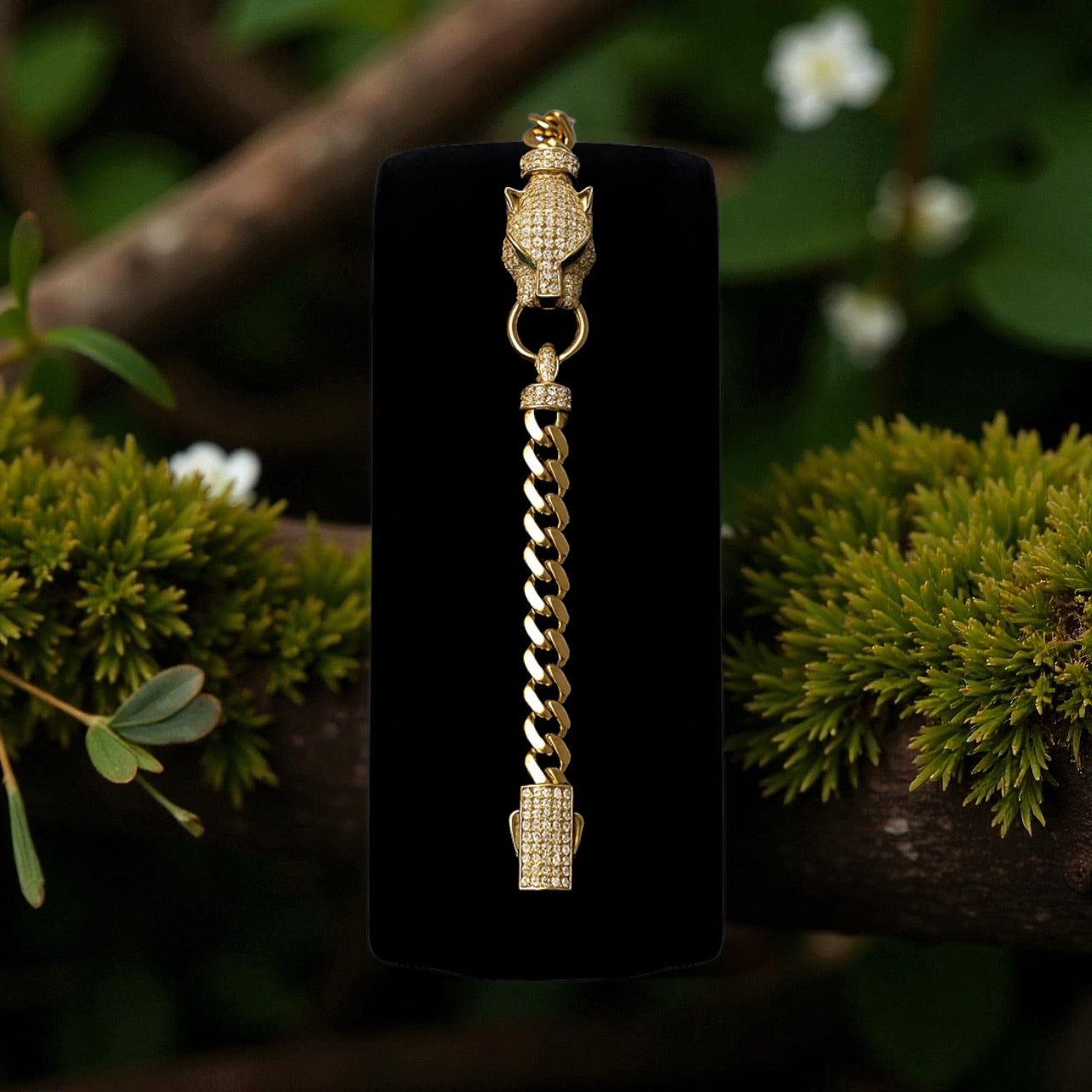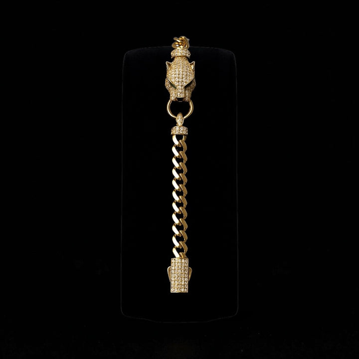 Esta pulsera es un modelo tipo Panther Luxury, inspirada en piezas de alta joyería. Destaca por su diseño llamativo: una cabeza de pantera incrustada con circonias que simboliza fuerza, elegancia y carácter.
