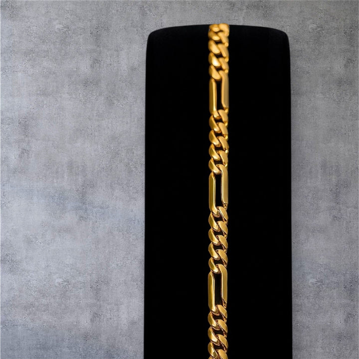 - Eslabones rectangulares largos intercalados con eslabones tipo curb (ligeramente torcidos).