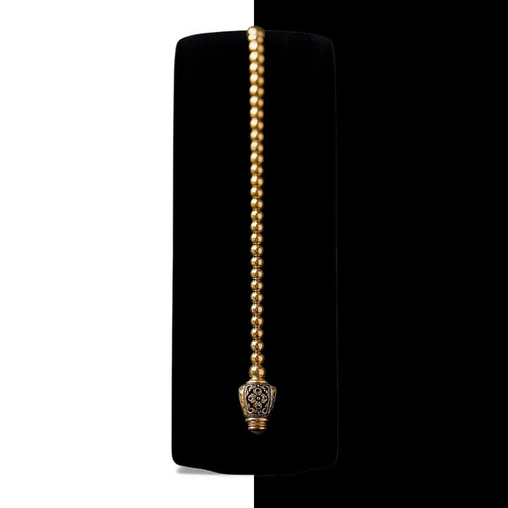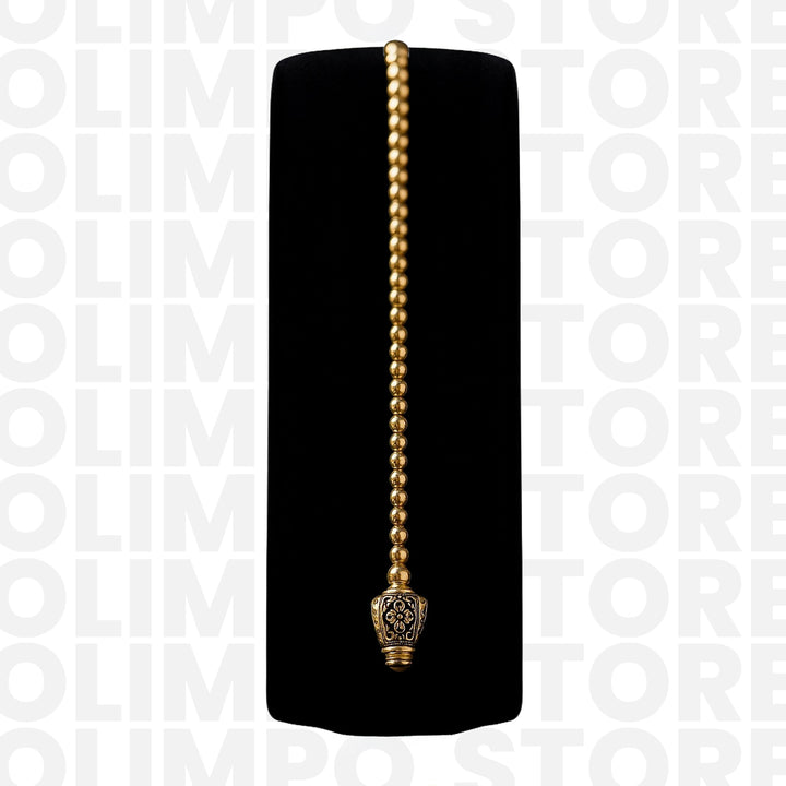 Esta pulsera tipo rosario destaca por su diseño clásico elaborado con cuentas doradas y un dije ornamental finamente detallado. Su estilo versátil la convierte en una pieza ideal para complementar atuendos formales o casuales, aportando un toque de sofisticación sin esfuerzo. Perfecta para quienes buscan accesorios con presencia, elegancia y un acabado refinado.