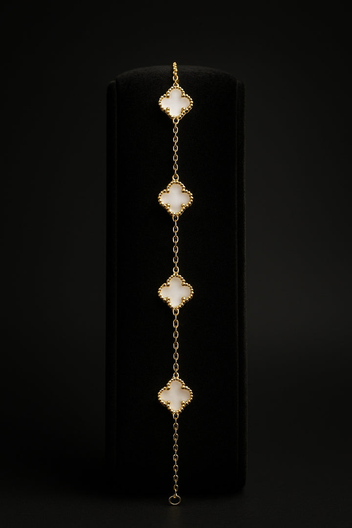 Esta pulsera de diseño inspirado en la icónica estética Alhambra combina la frescura del nácar blanco con la elegancia del baño de oro. Su patrón de tréboles de cuatro pétalos, enmarcados por un detalle de microbolitas, y su eslabón fino tipo cable, crean una pieza delicada, femenina y atemporal, ideal para looks sofisticados.